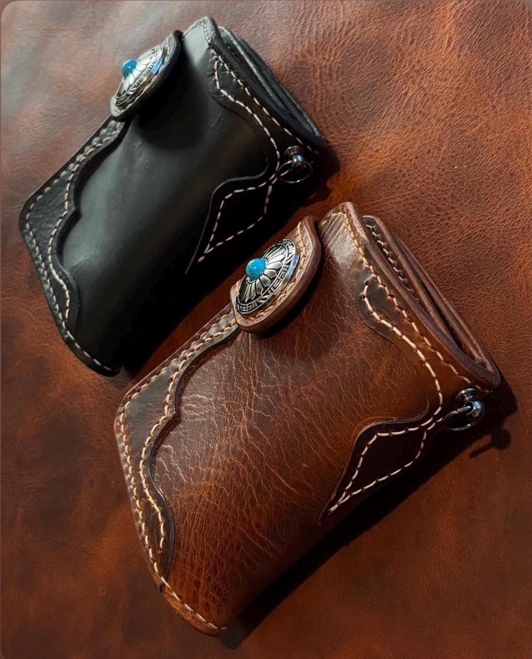 Biker wallet handcrafted using highest quality Waxy Cognac Leather comes from Conceria La Bretagna Tannery in Italy. It will hold up to the most rugged of use and develop a beautiful and unique patina over time.