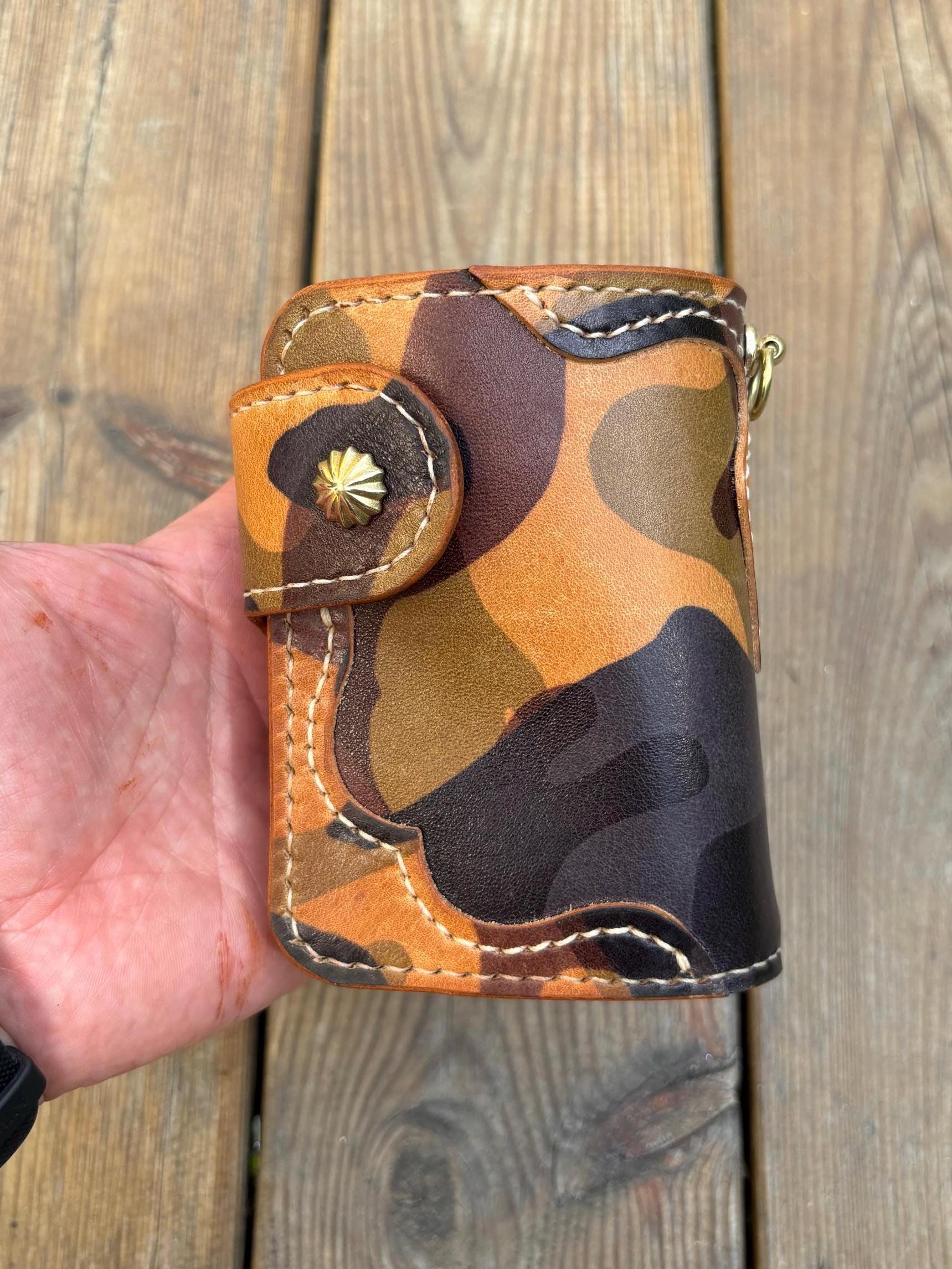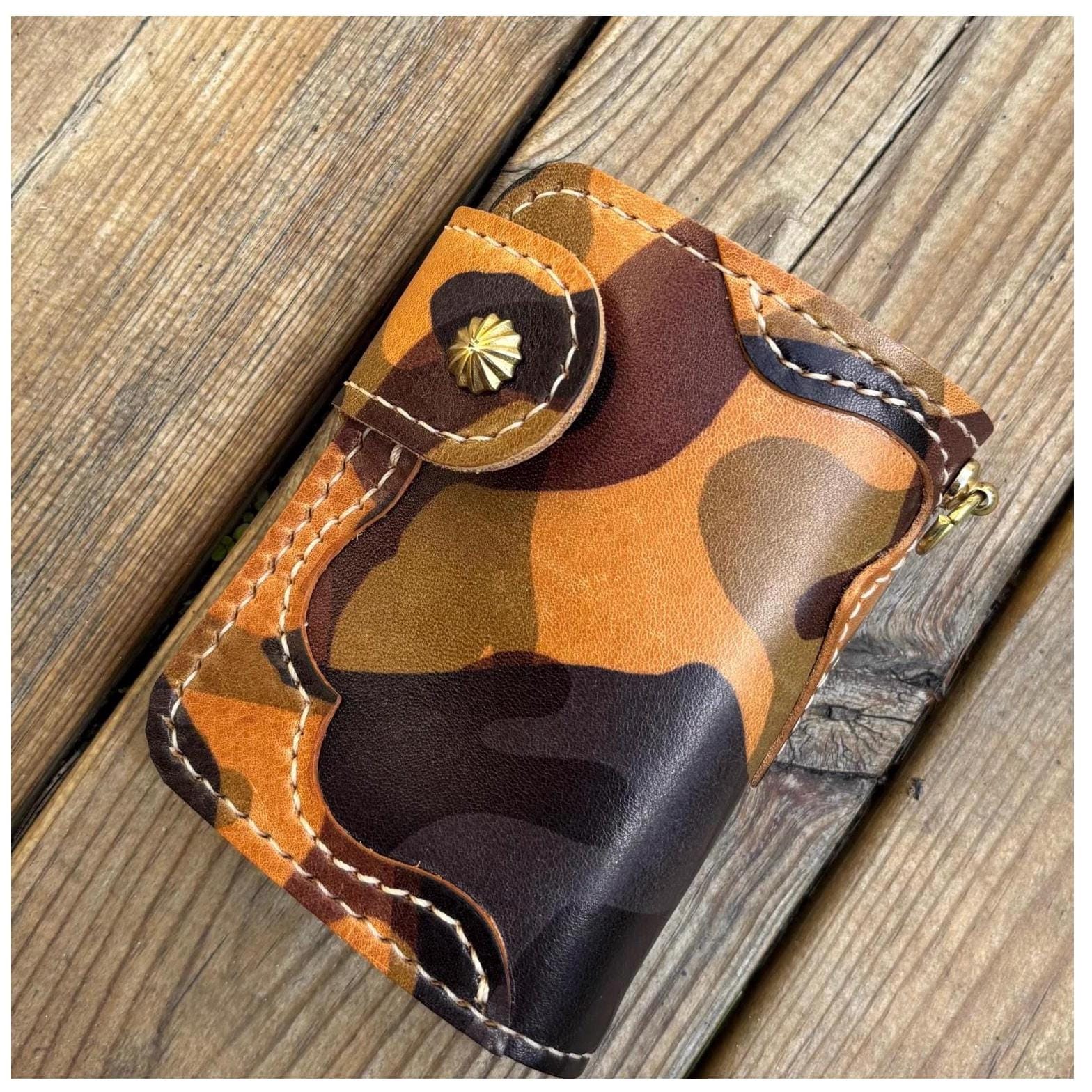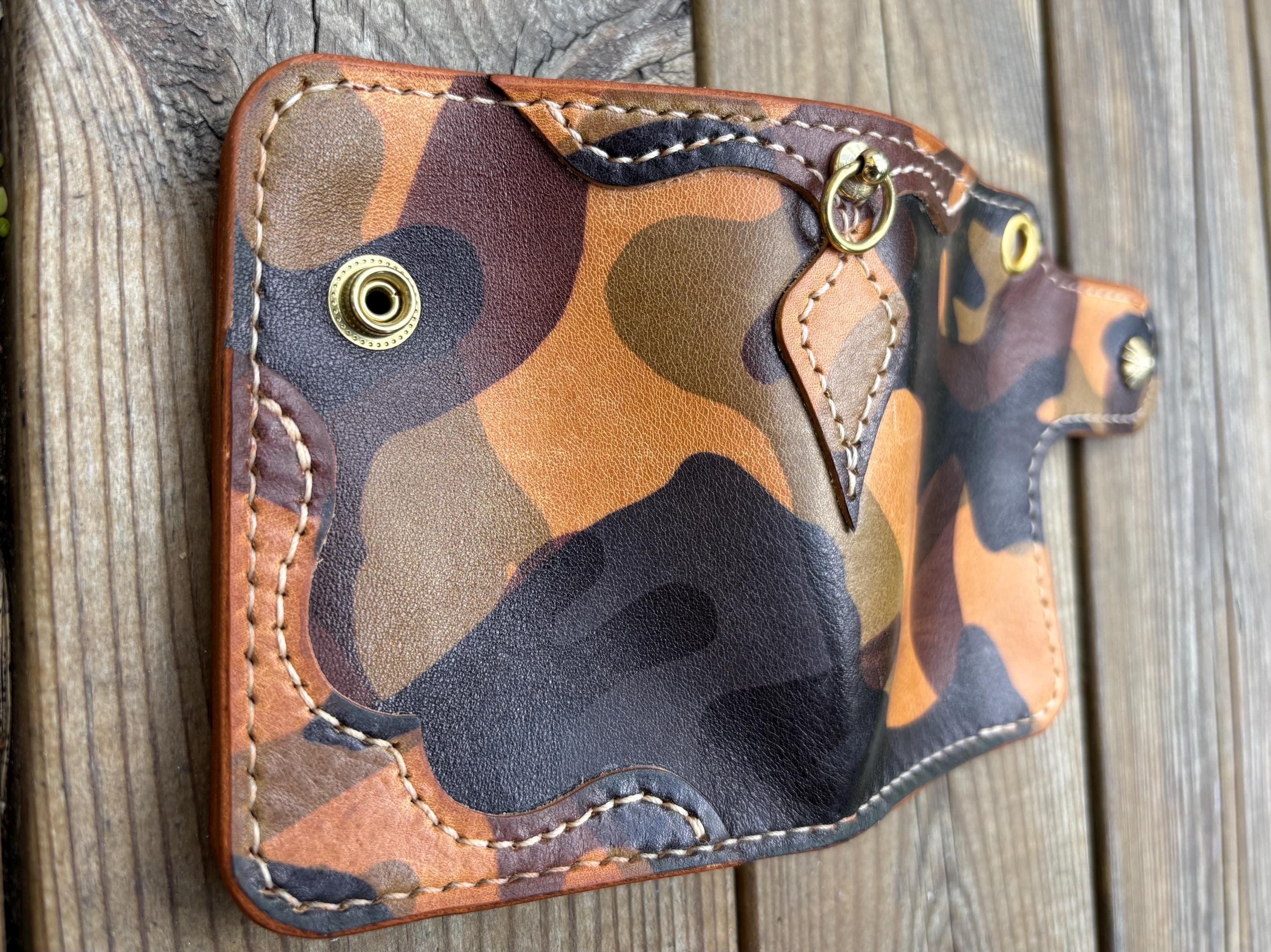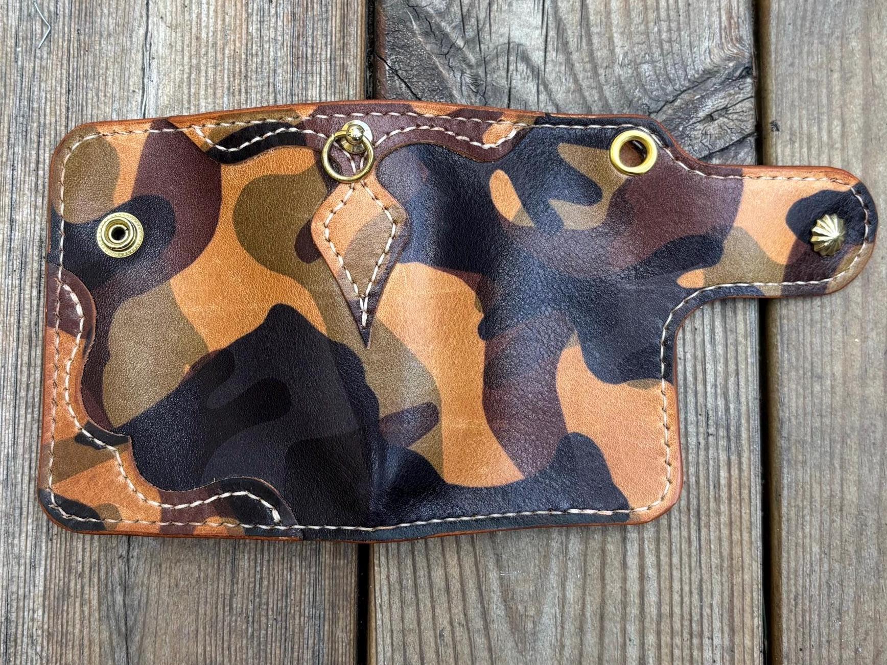 This handmade biker wallet with braided leather lanyard is handstitched using premium EL VAQUERO fully vegetable tanned leather. One of best Camo leather in the world from Conceria La perla azzura from Italy. This leather is known for its strength, rich texture, and ability to age beautifully, making it ideal for rugged everyday use.