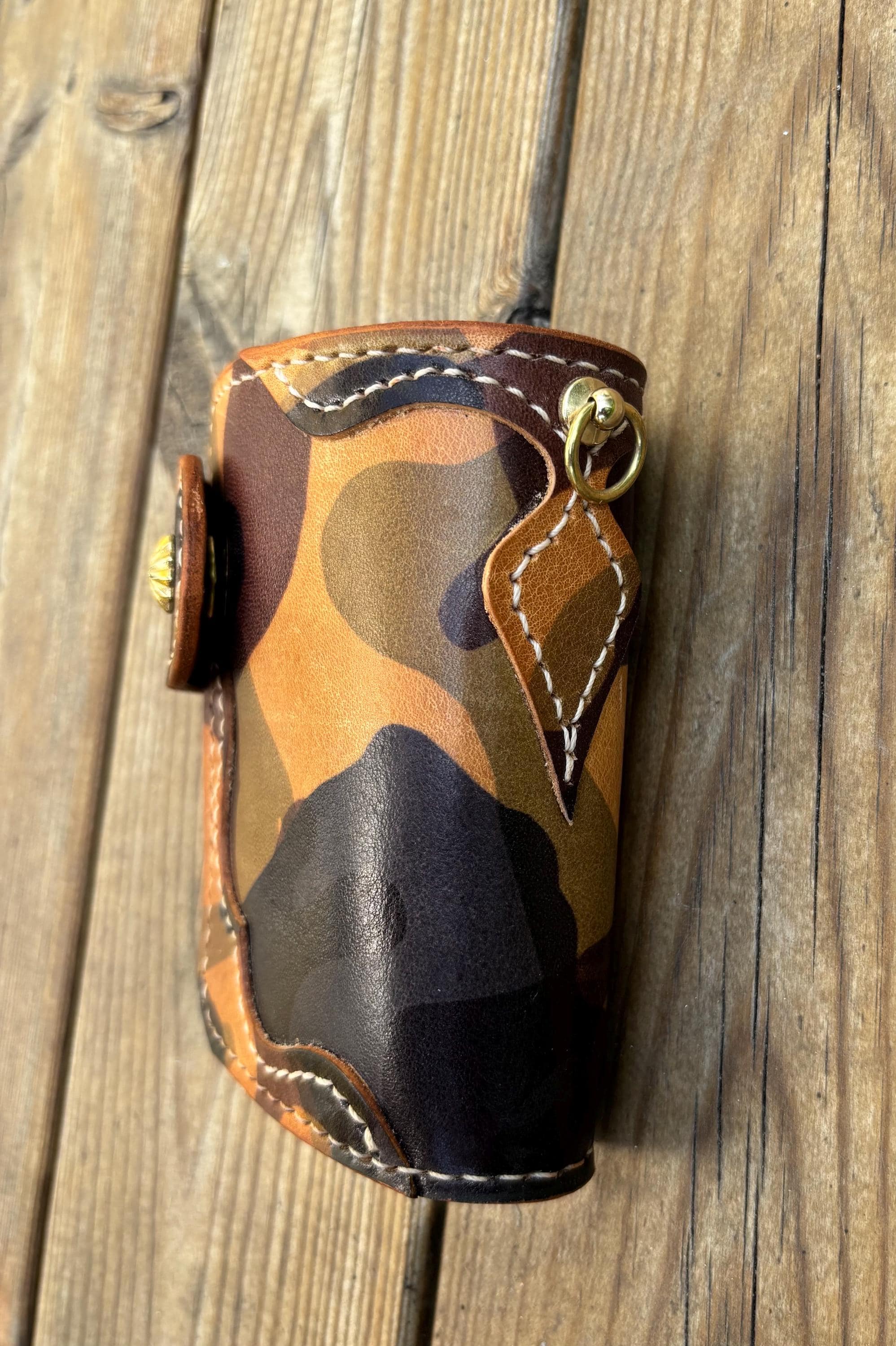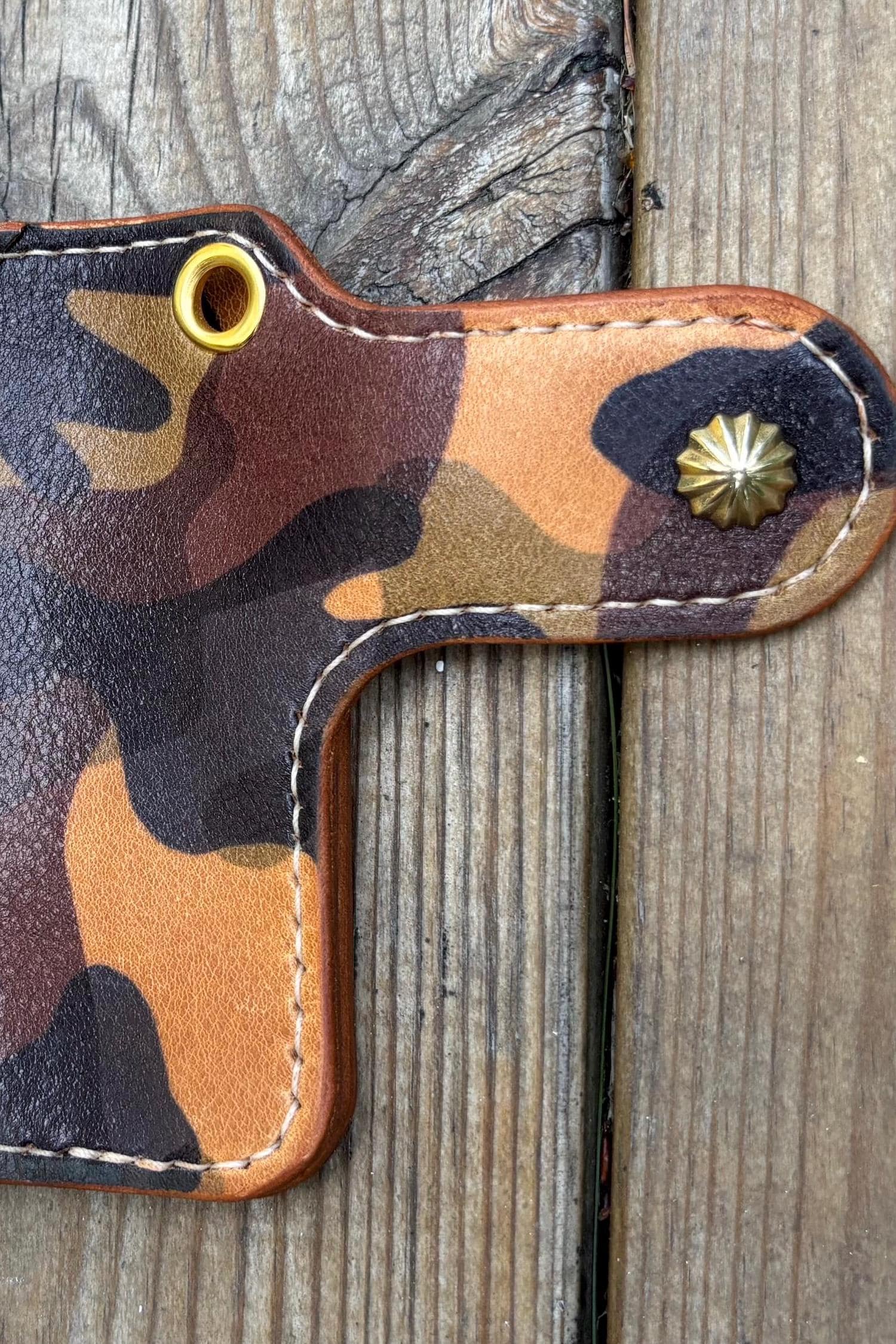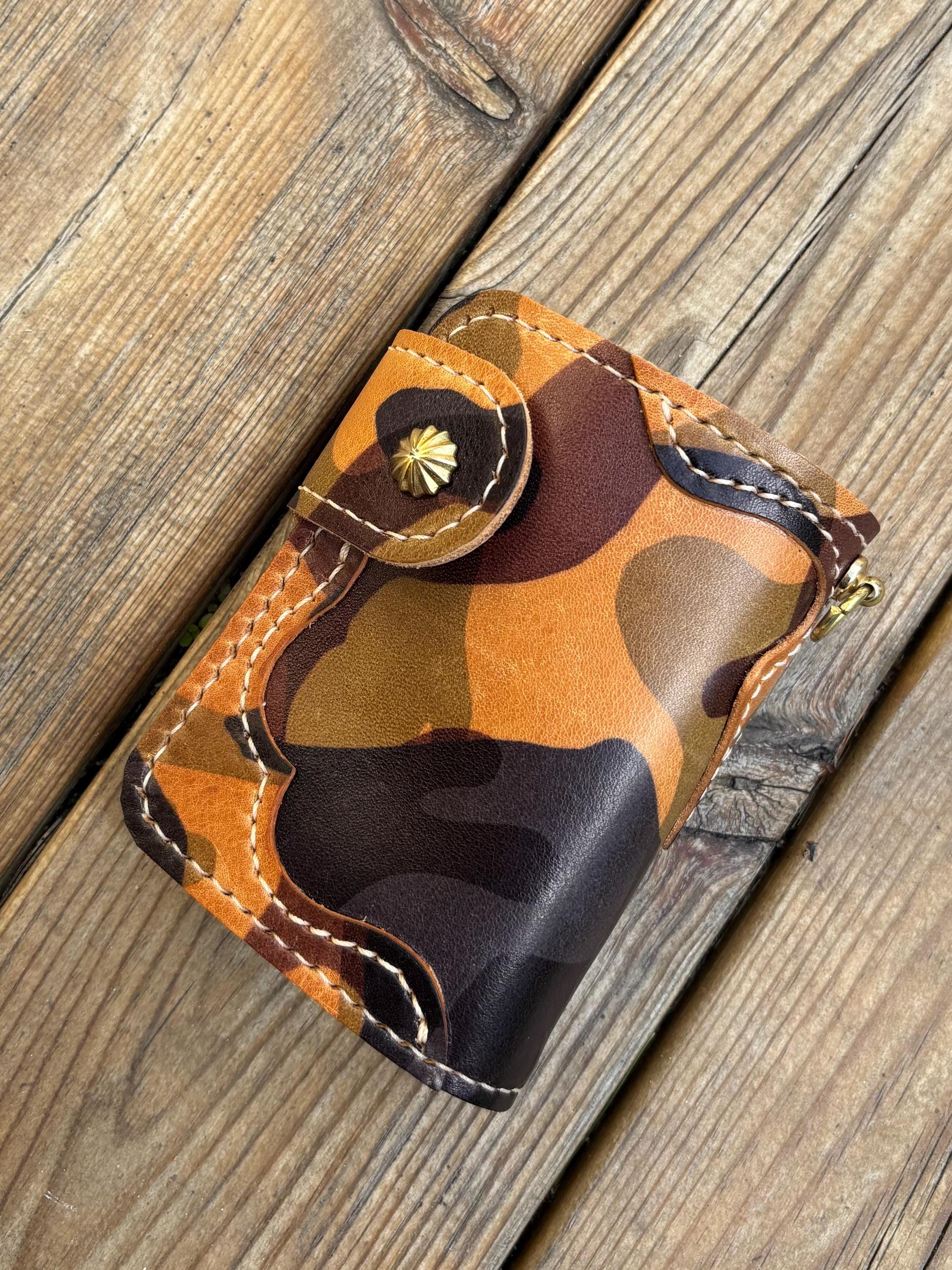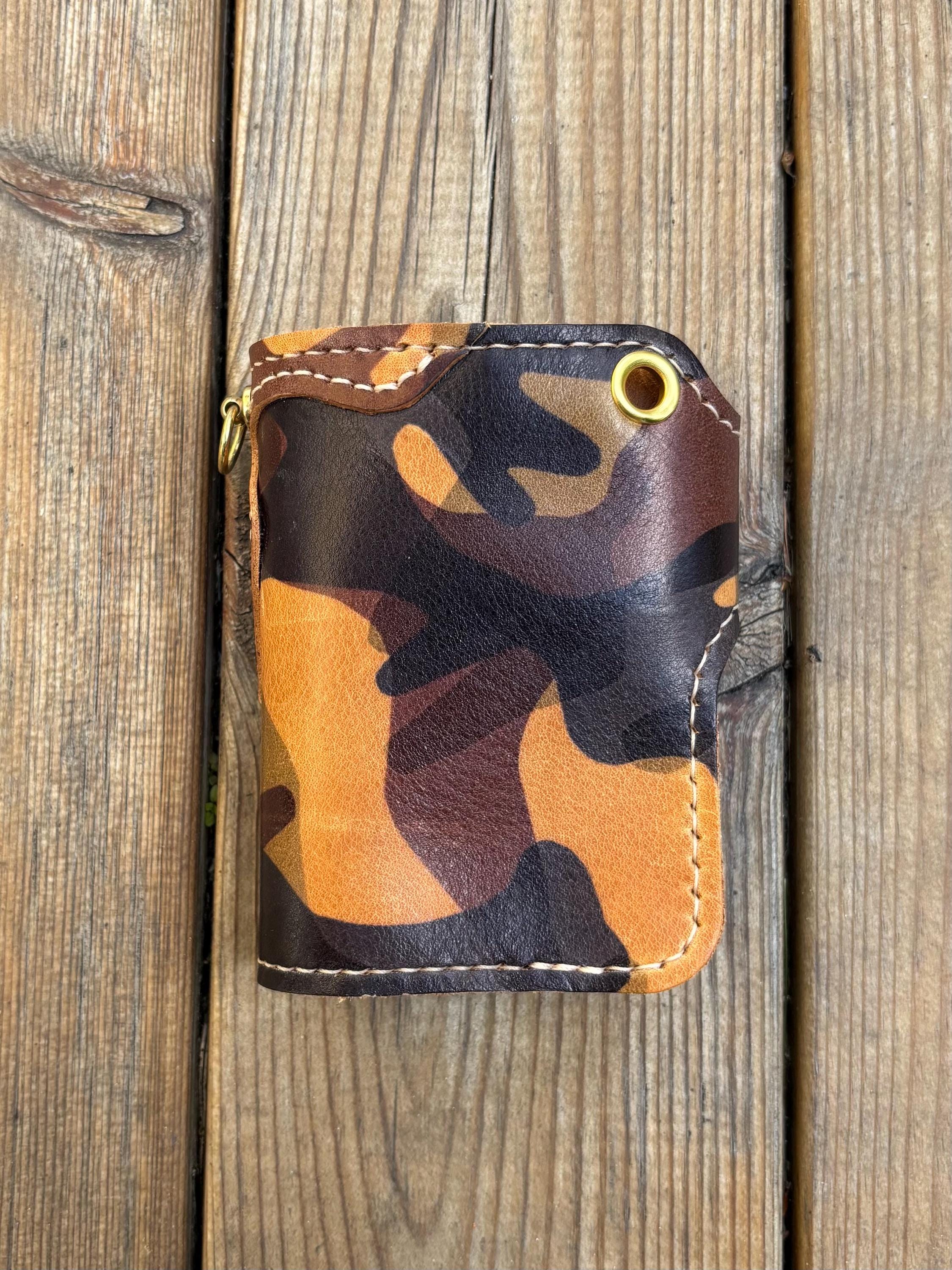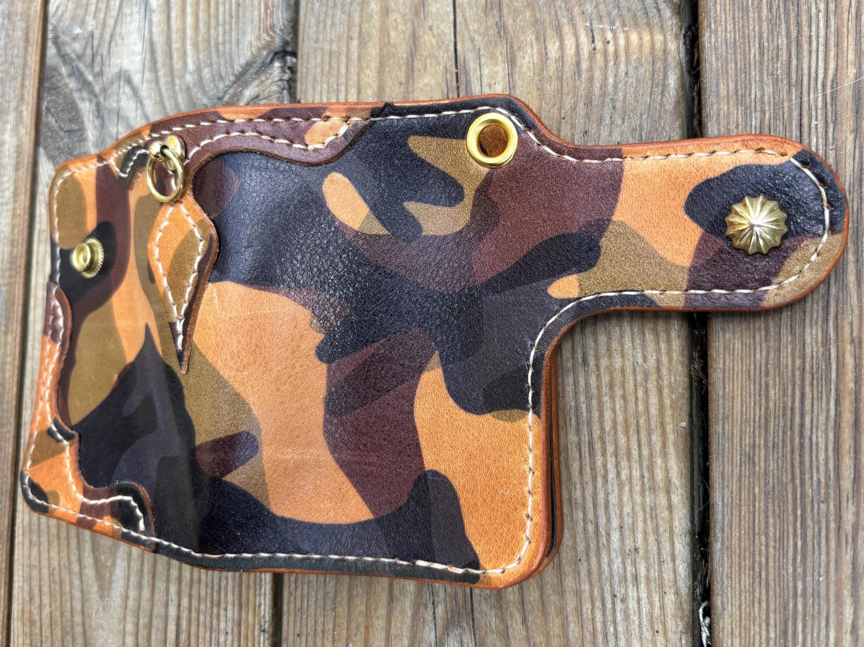 This handmade biker wallet with braided leather lanyard is handstitched using premium EL VAQUERO fully vegetable tanned leather. One of best Camo leather in the world from Conceria La perla azzura from Italy. This leather is known for its strength, rich texture, and ability to age beautifully, making it ideal for rugged everyday use.