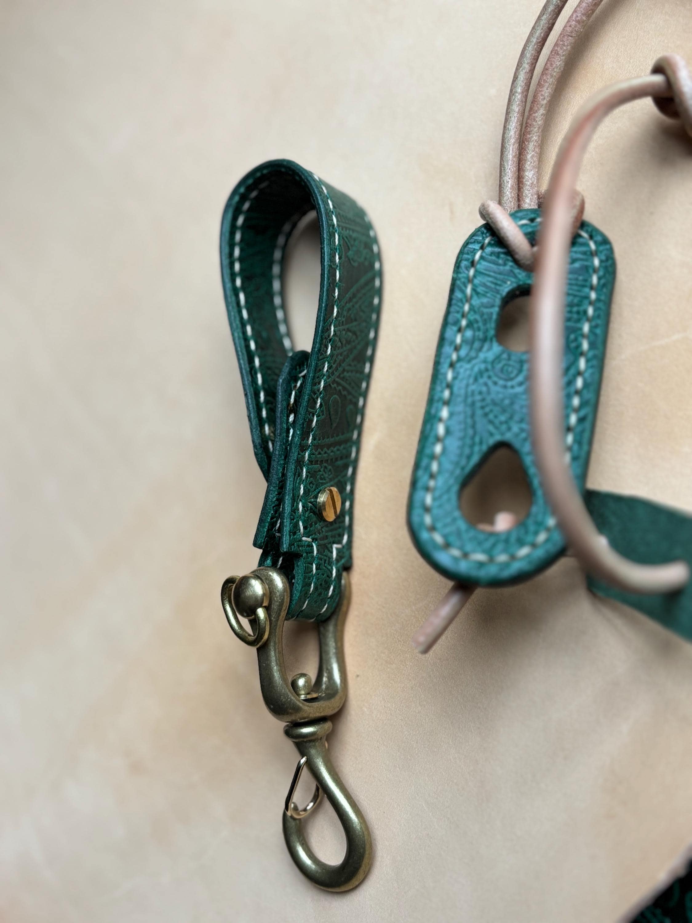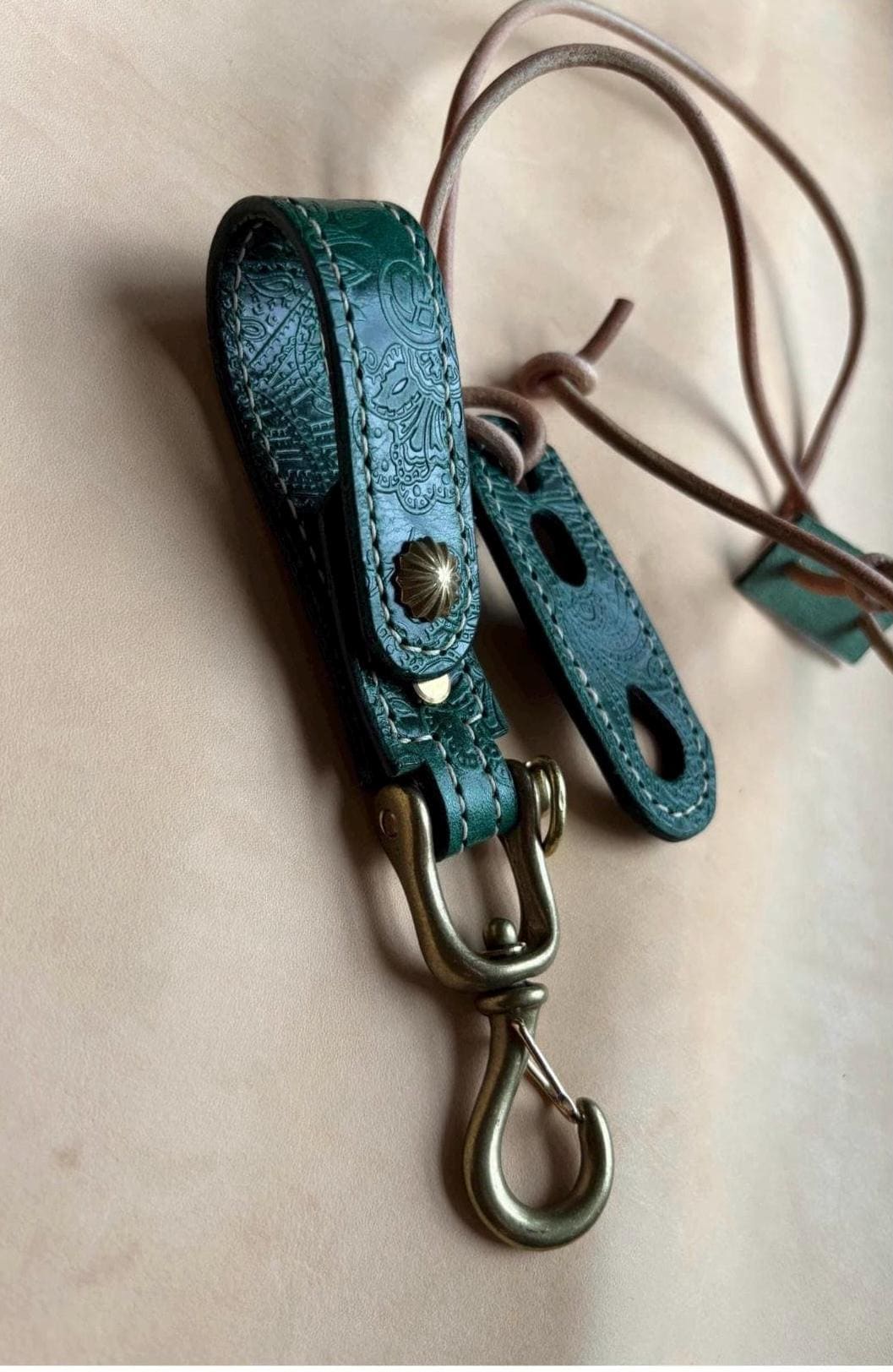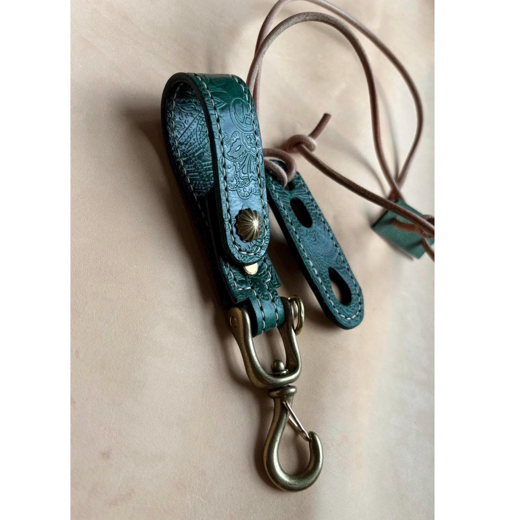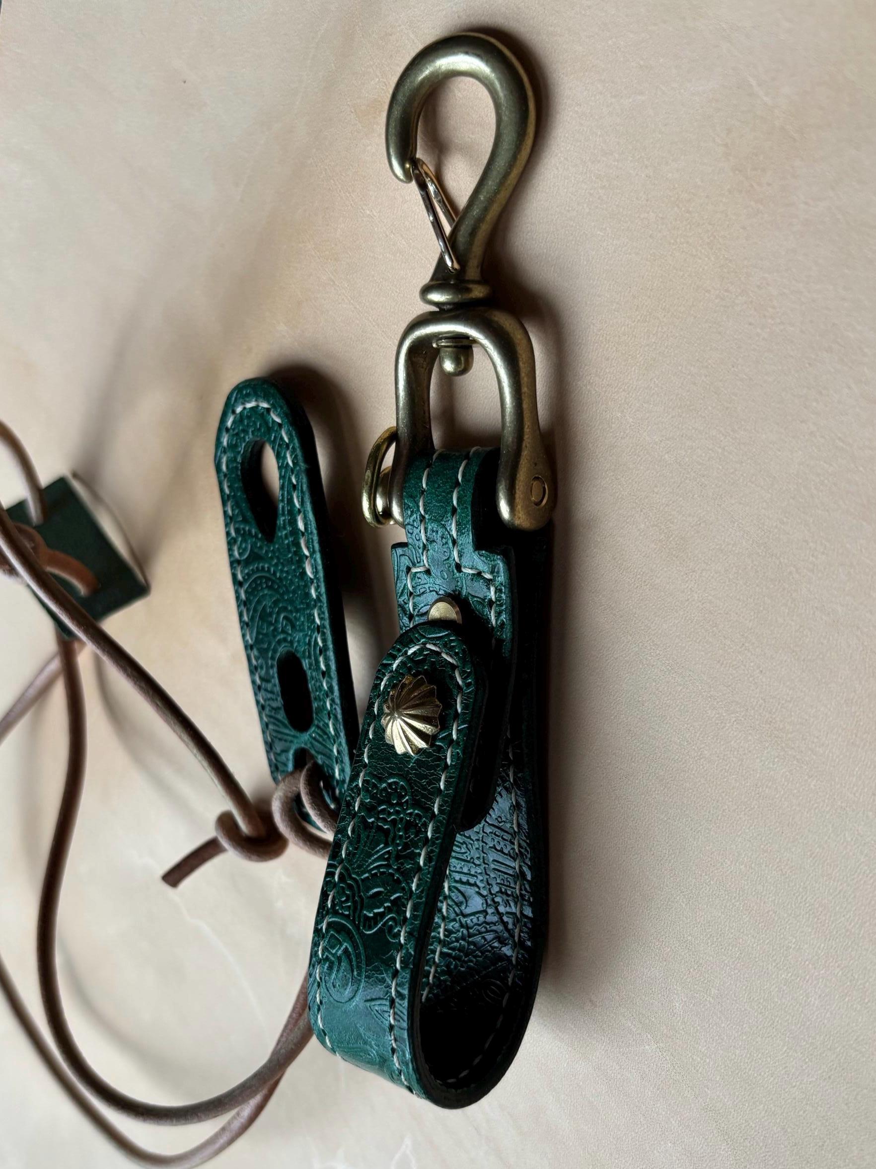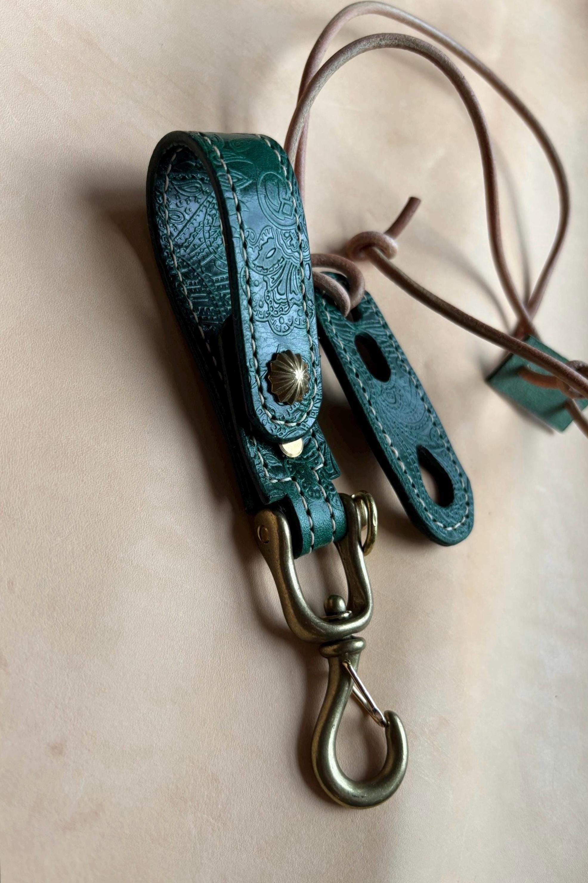 The key belt loop and adjustable sunglass holder are handcrafted using EL VAQUERO, equipped with JAPANESE SOLID BRASS SWIVEL HOOK SNAP , a fully vegetable-tanned leather from Conceria La Perla Azzurra, Italy,