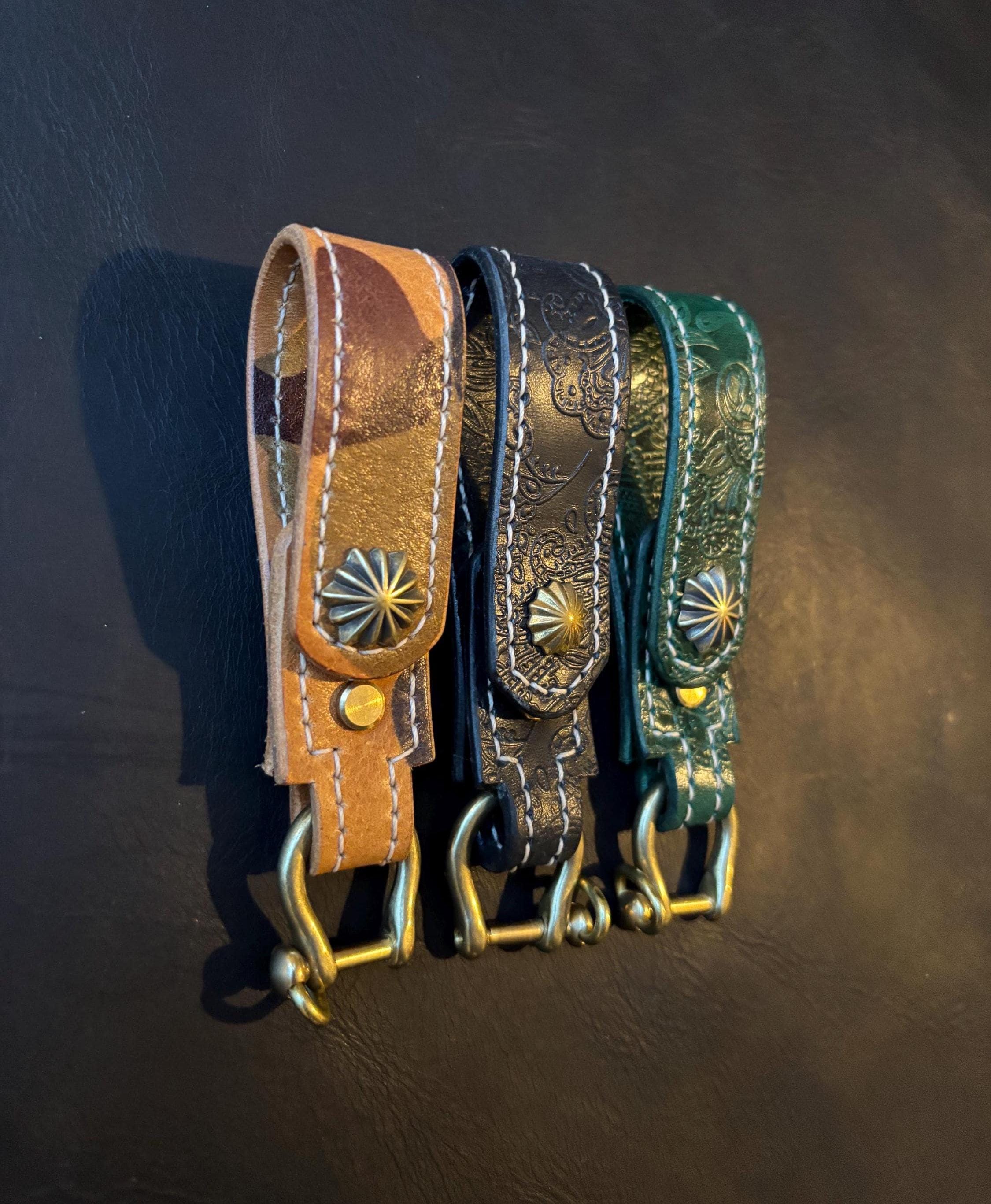 Designed to attach securely to your belt, this leather belt loop key holder features solid brass hardware for a classic, rugged look. The embossed leather detailing and hand-stitched edges add character while ensuring long-lasting performance.