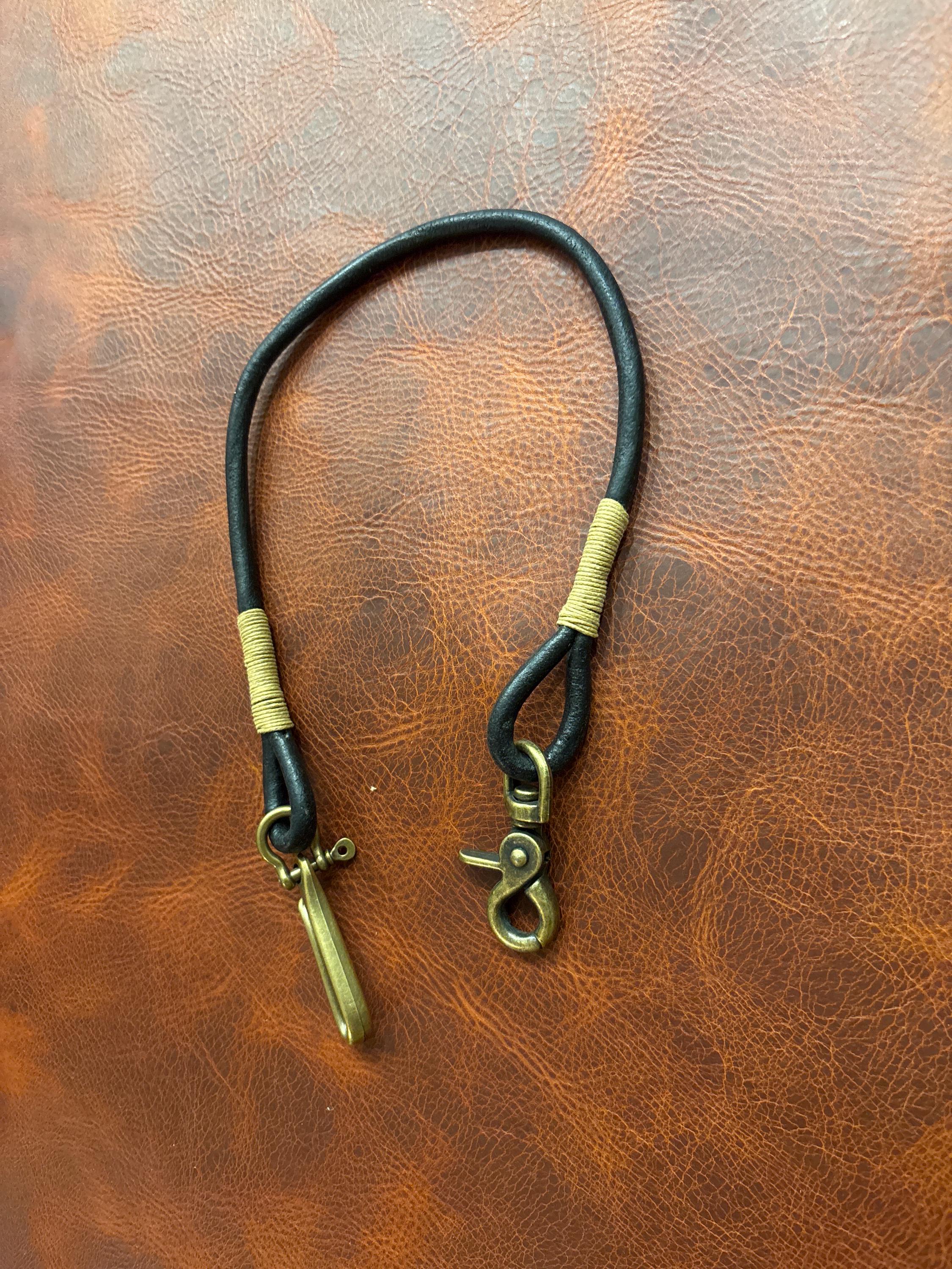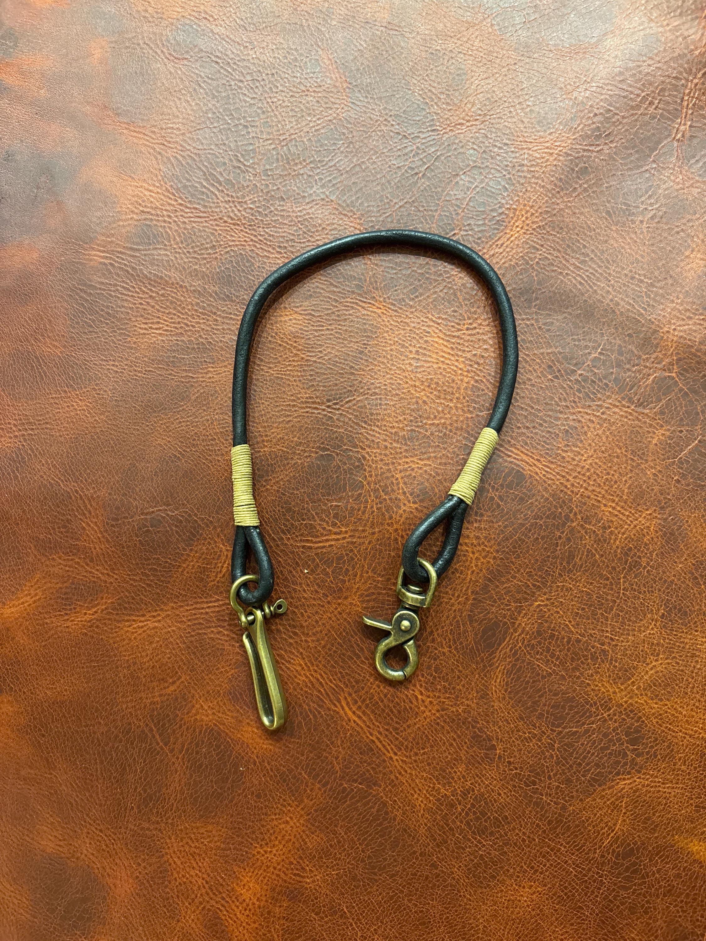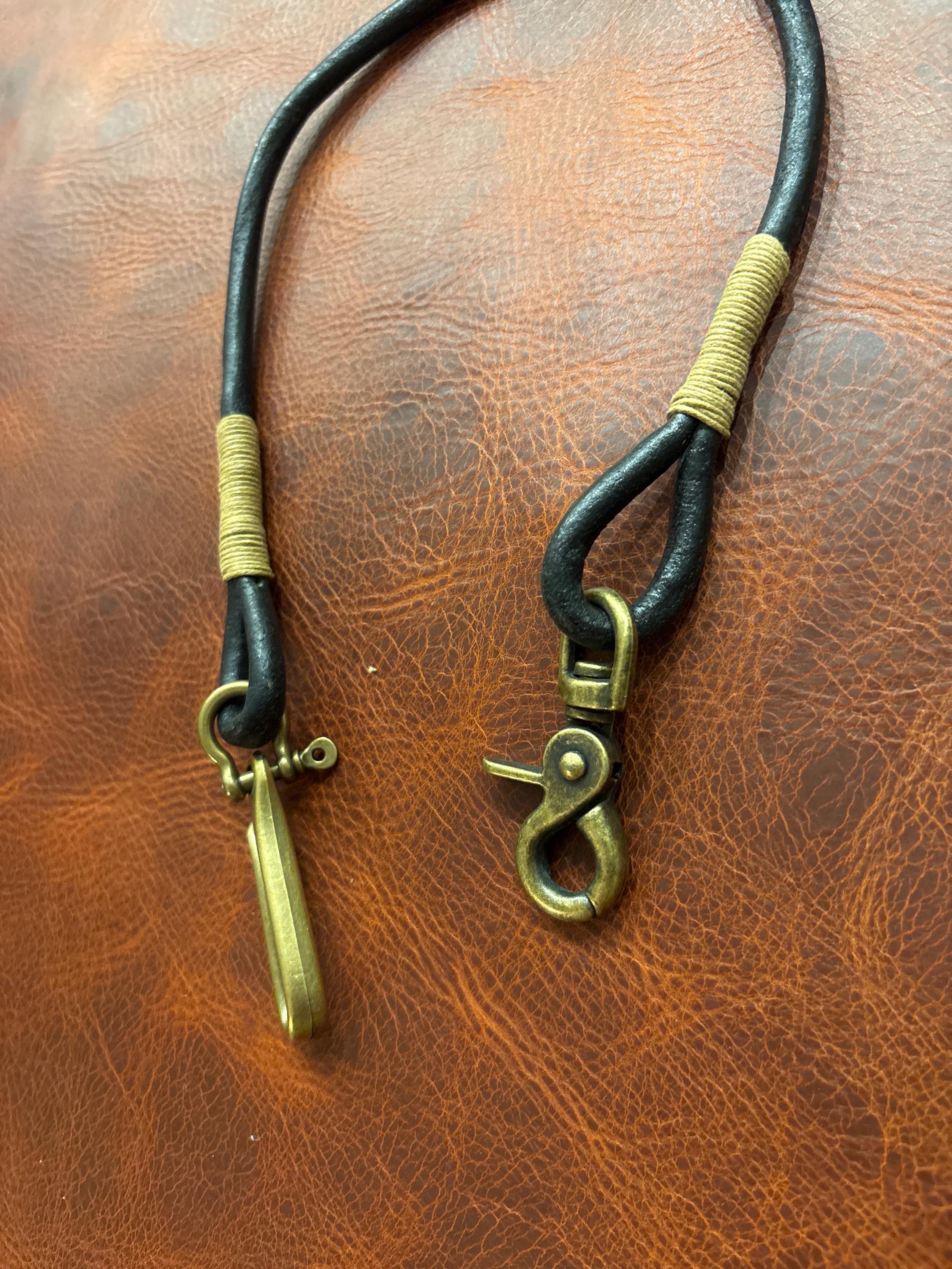 Handmade black round Leather Rope Lanyard with Solid Brass Trigger Snap and belt hook.