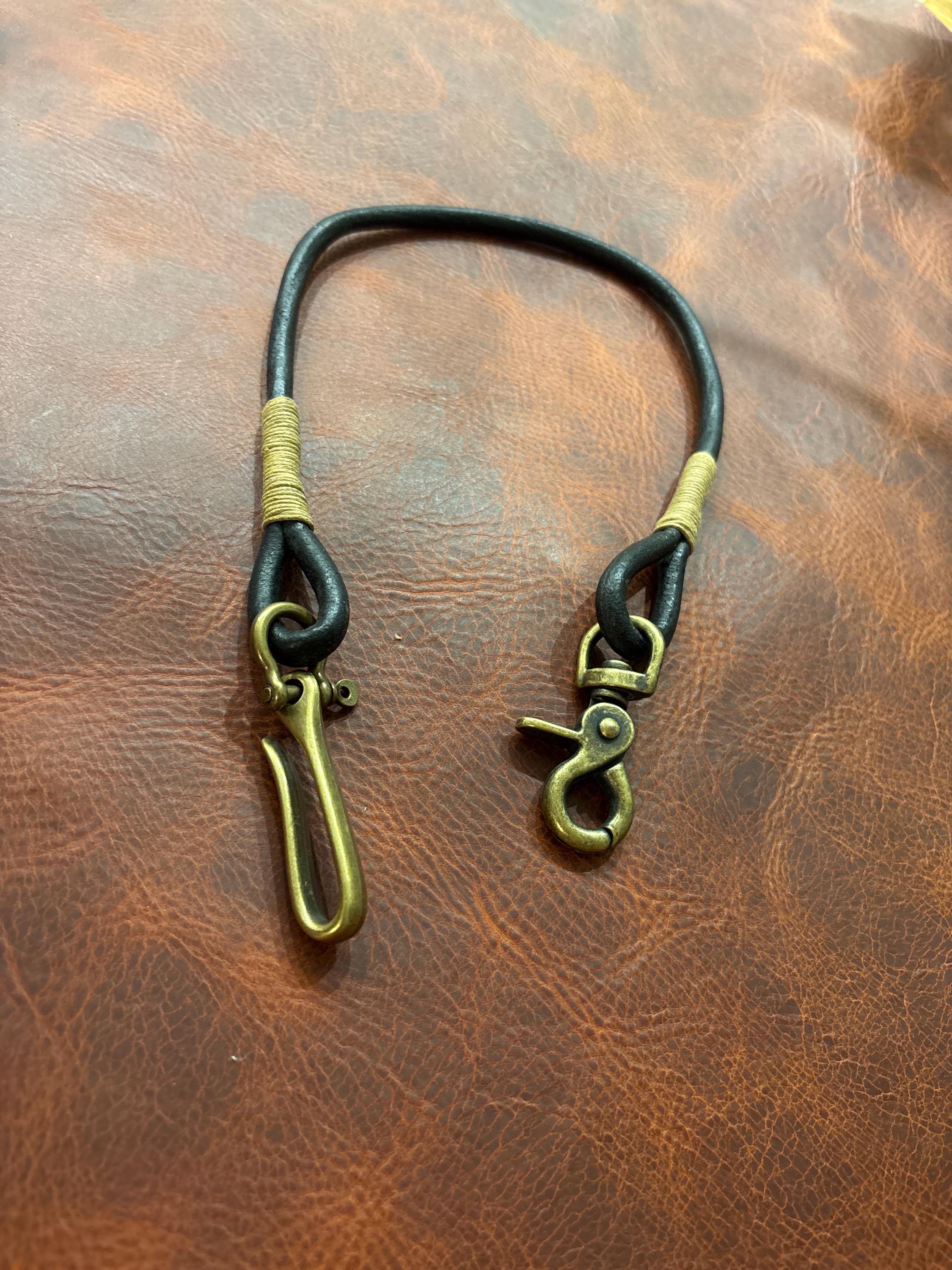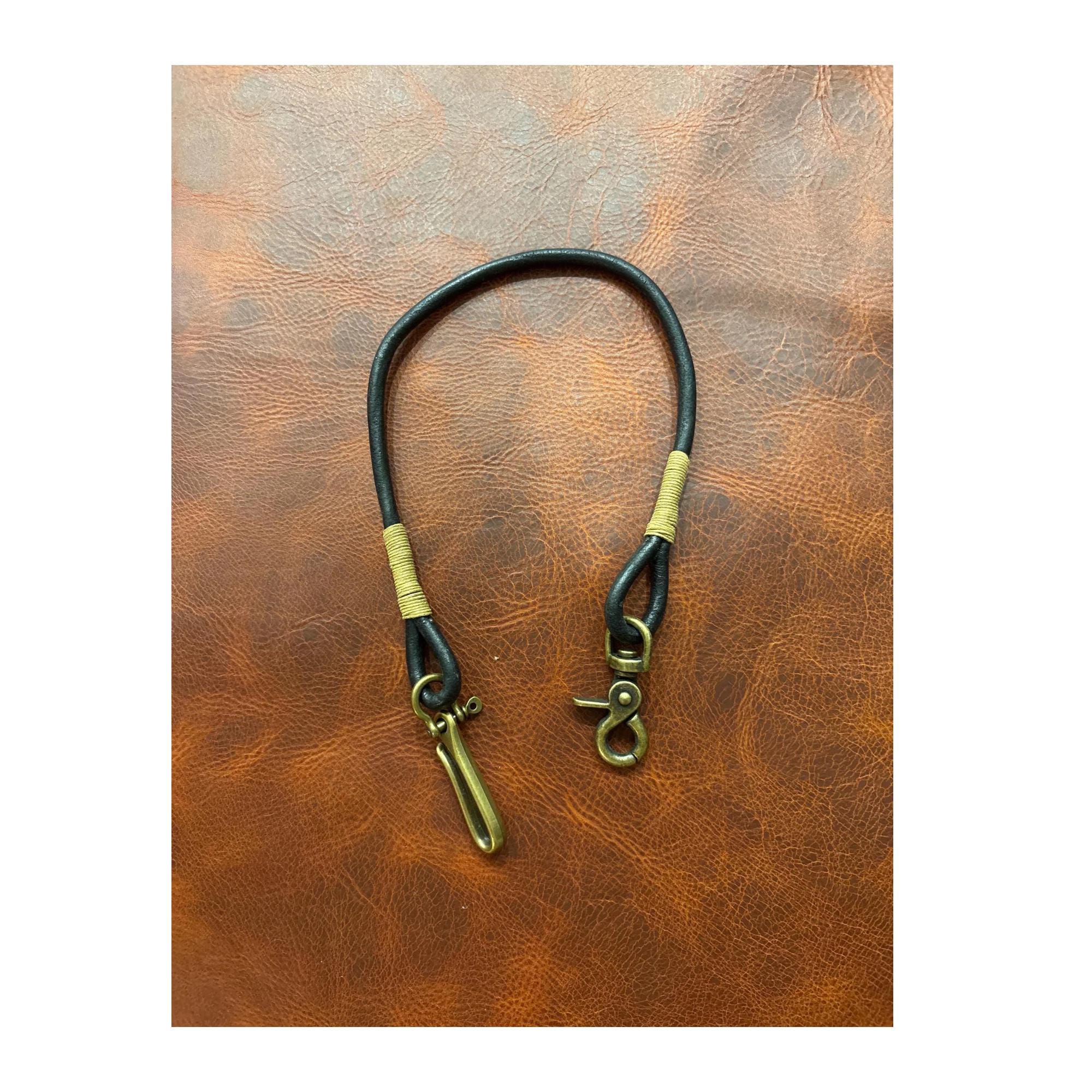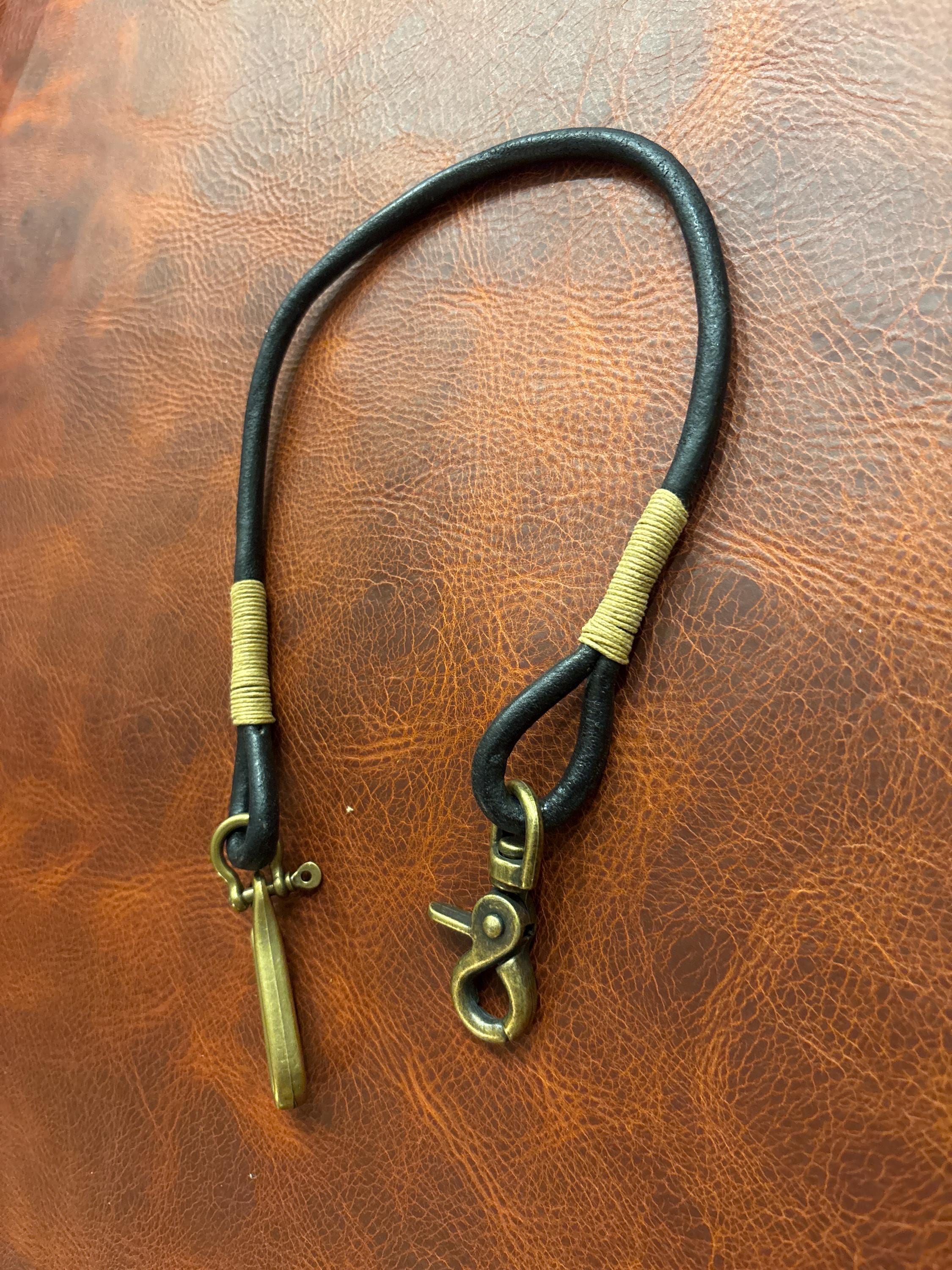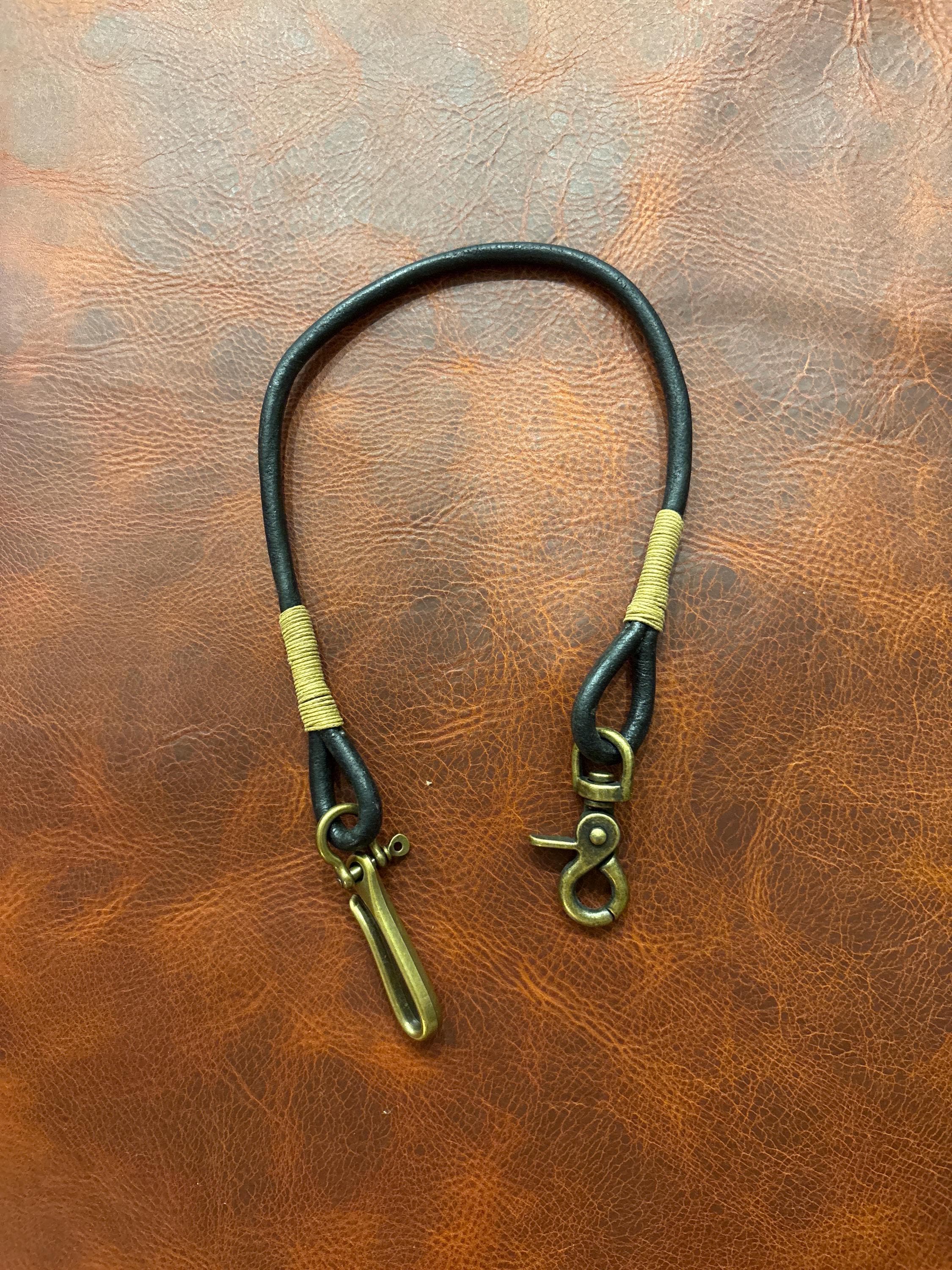 Handmade black round Leather Rope Lanyard with Solid Brass Trigger Snap and belt hook.