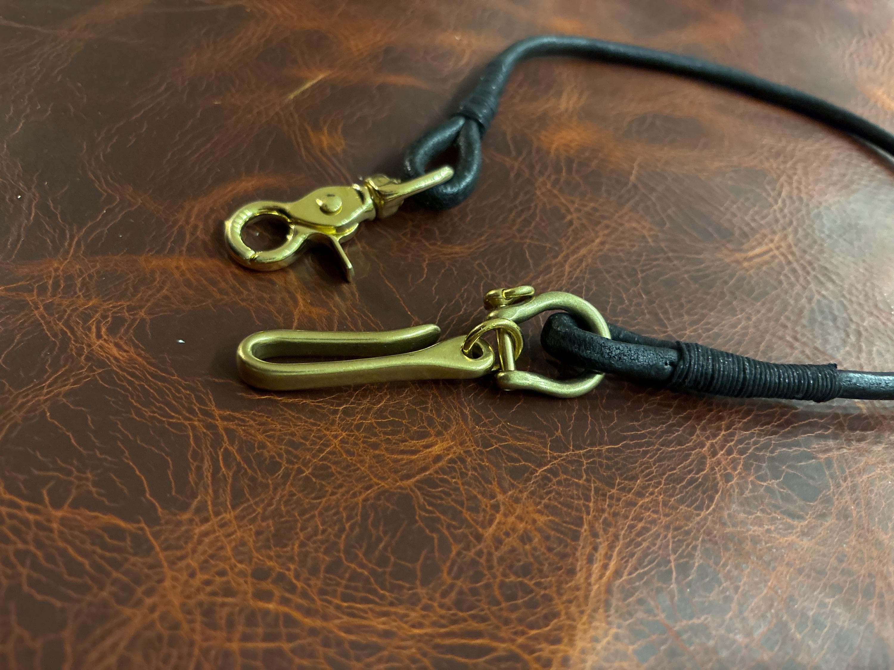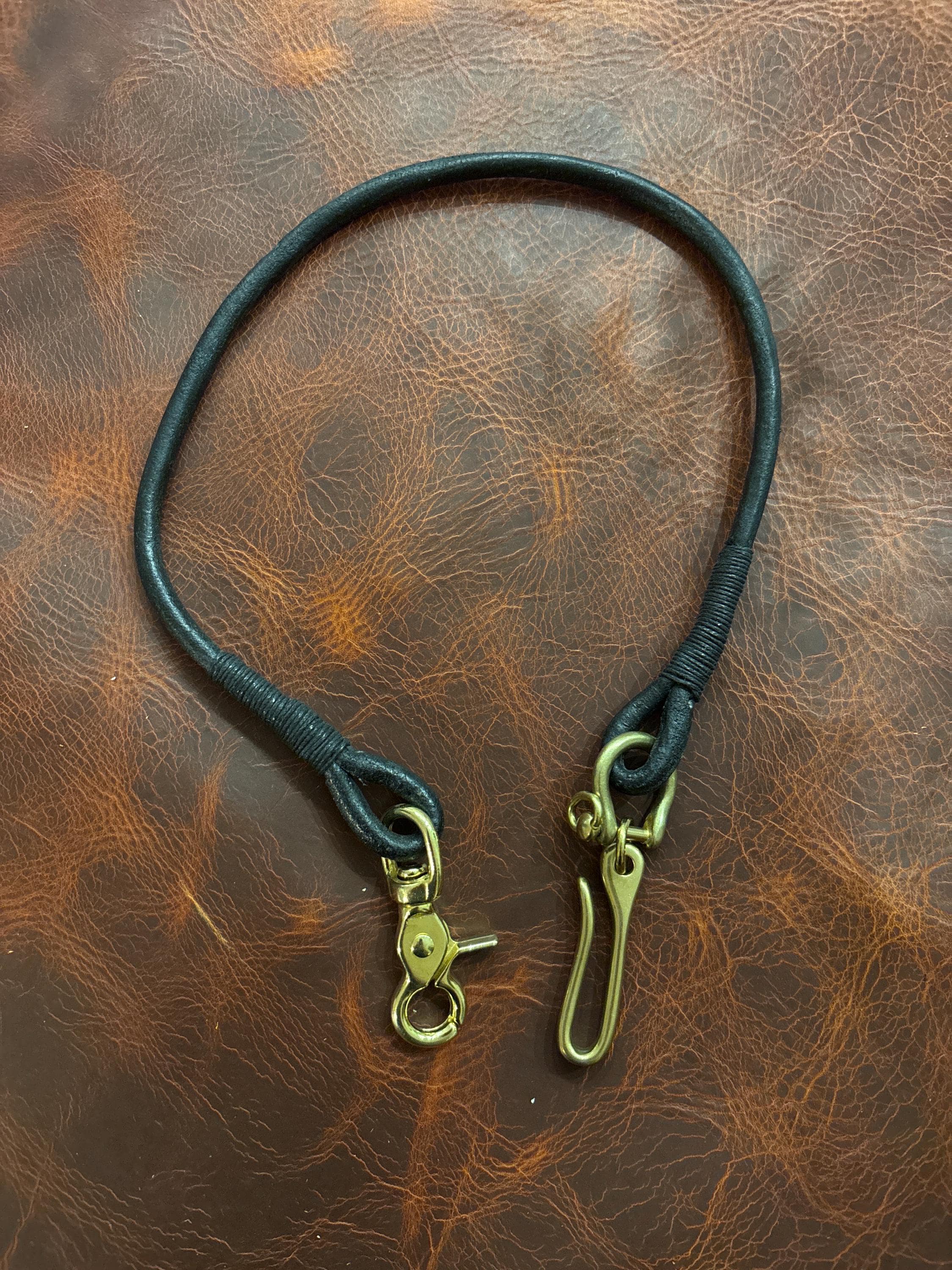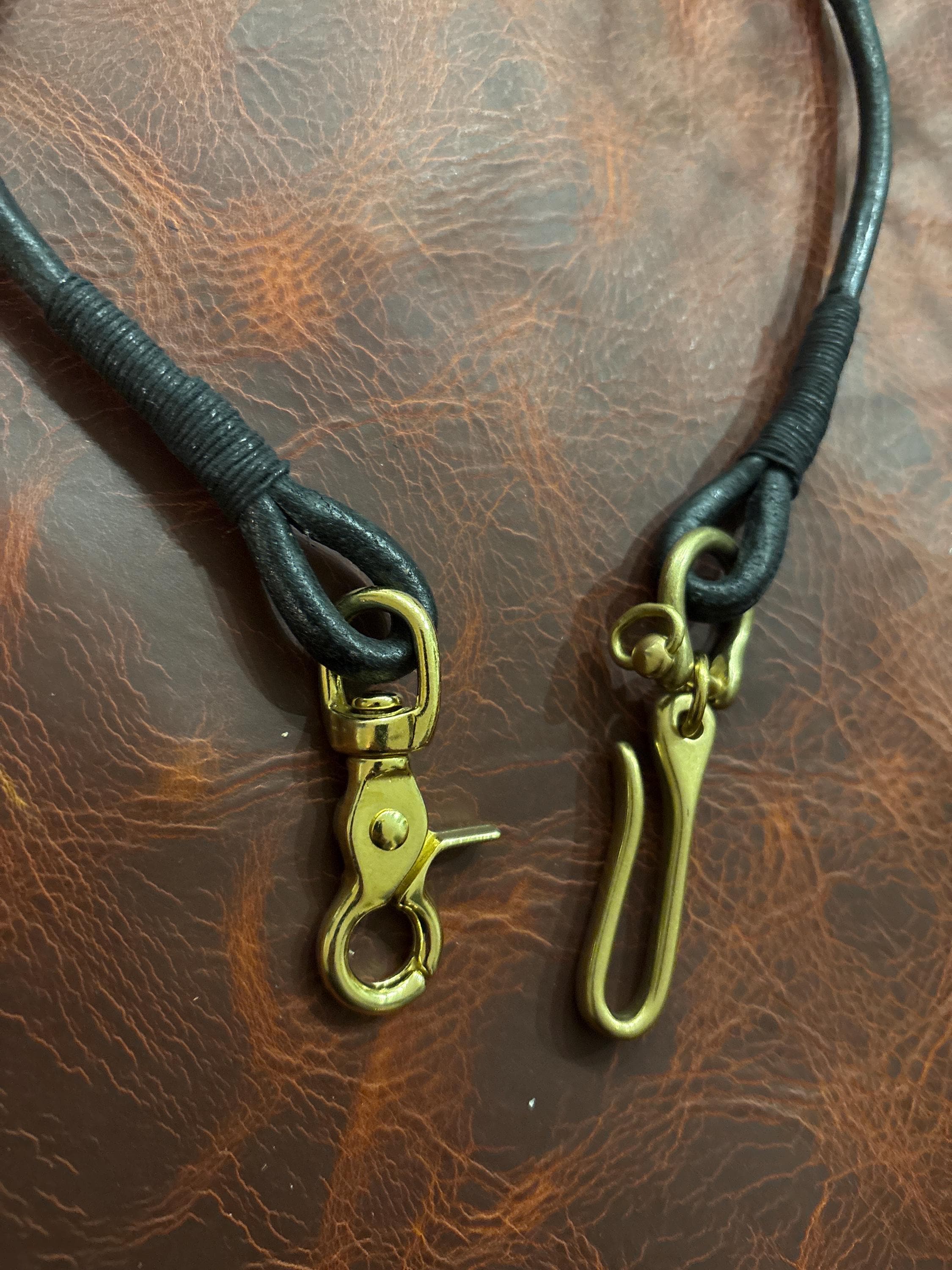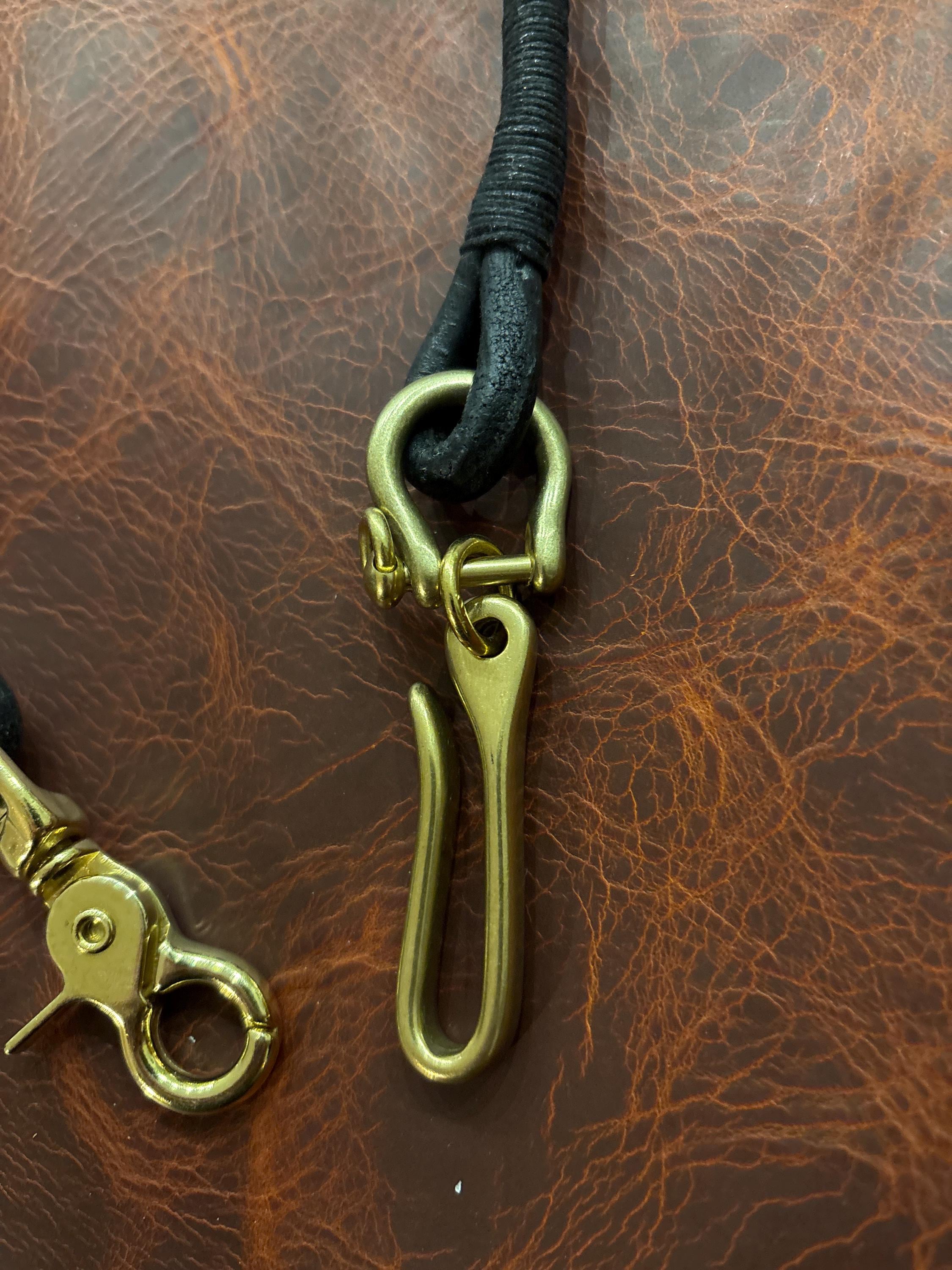 Handmade black round Leather Lanyard with Solid Brass Trigger Snap and belt hook for Leather Chain Wallet