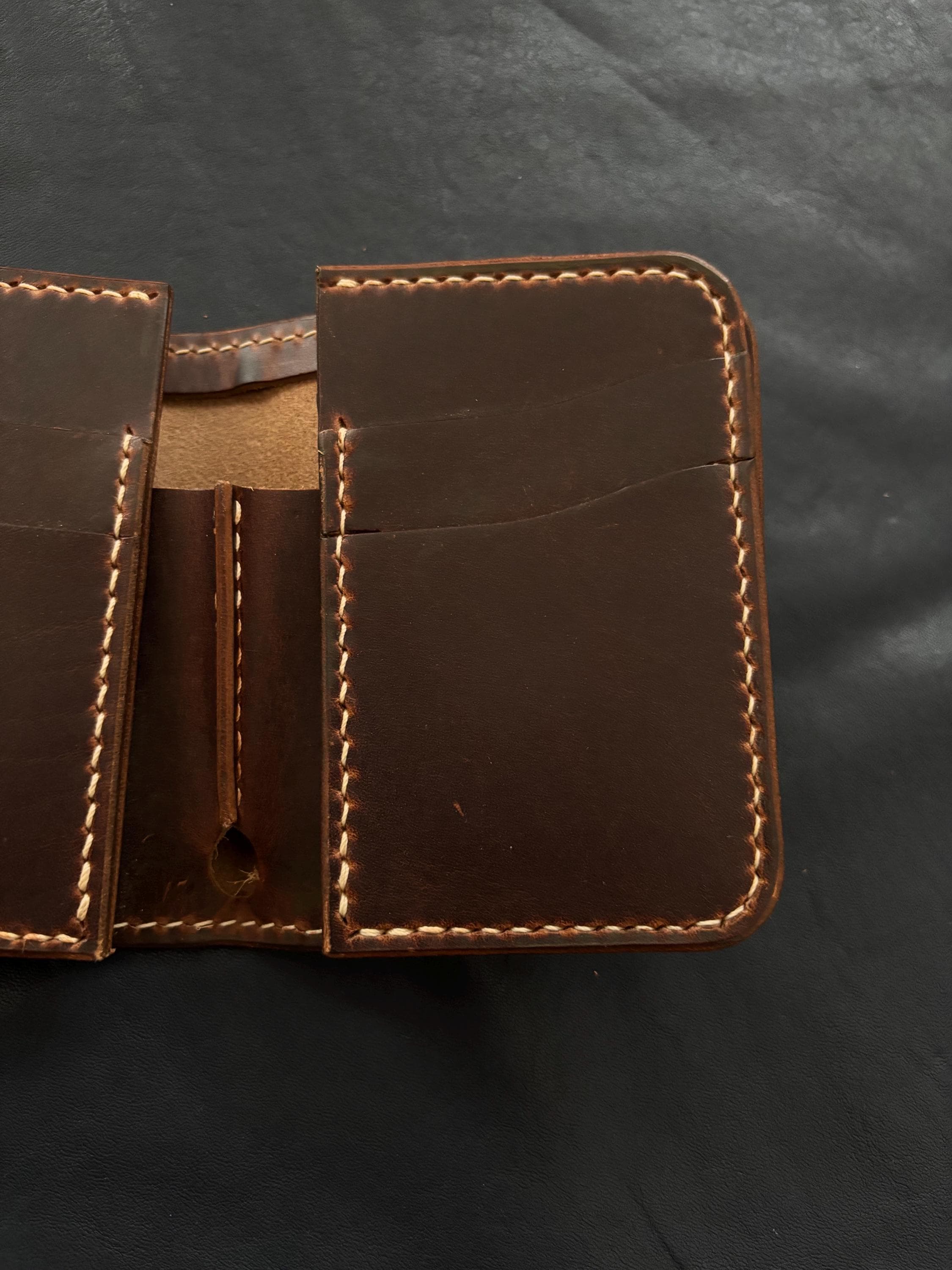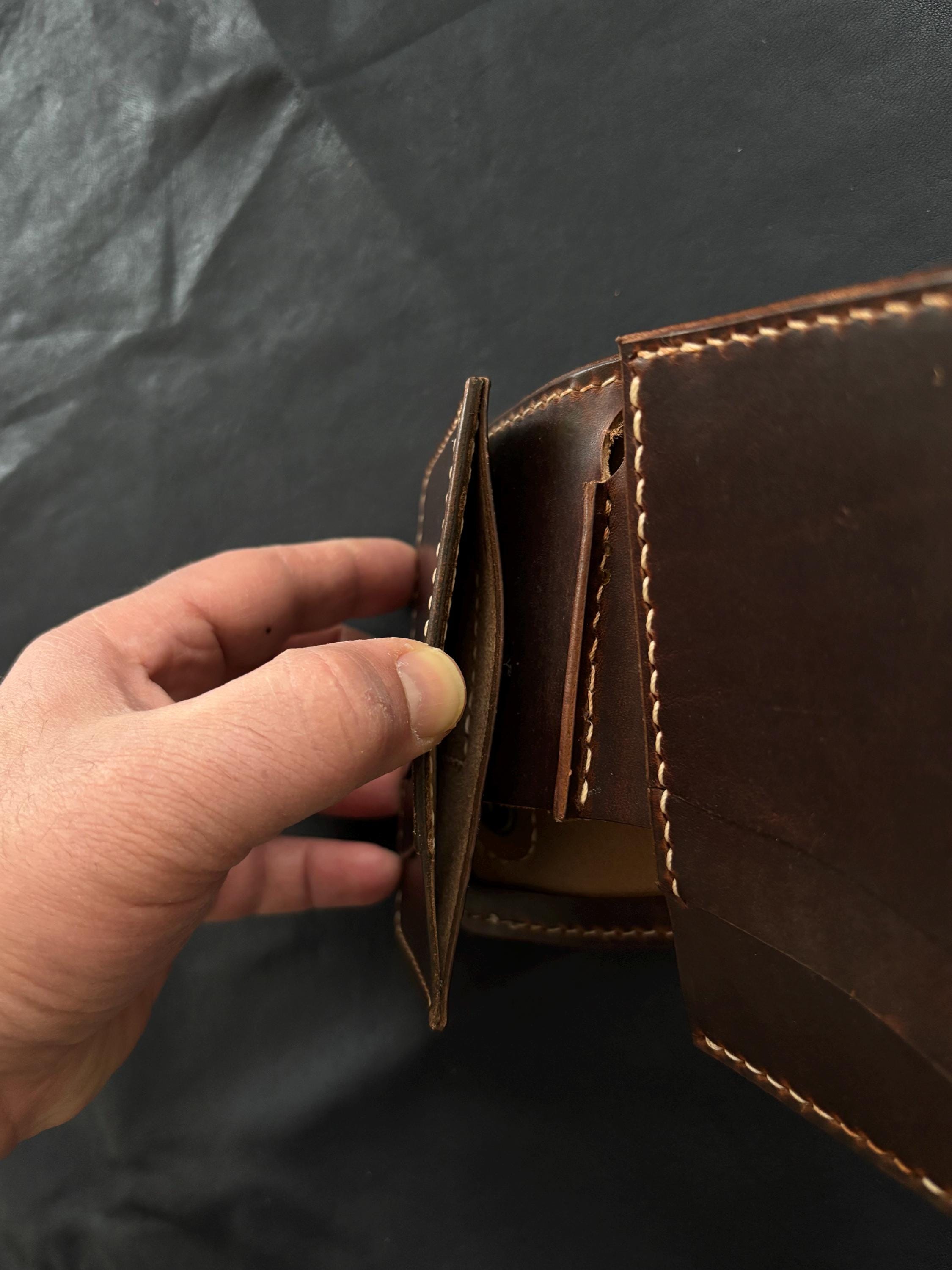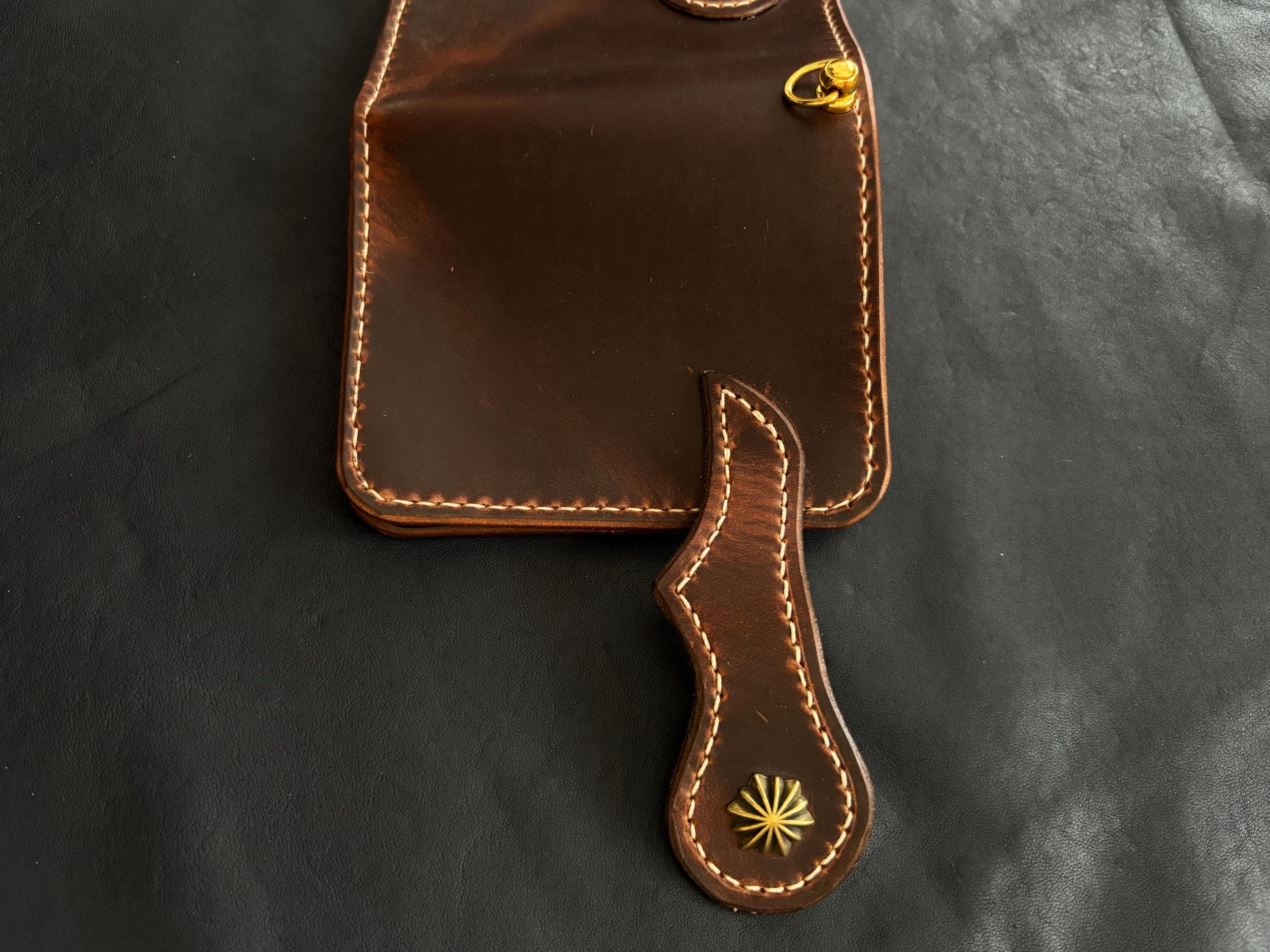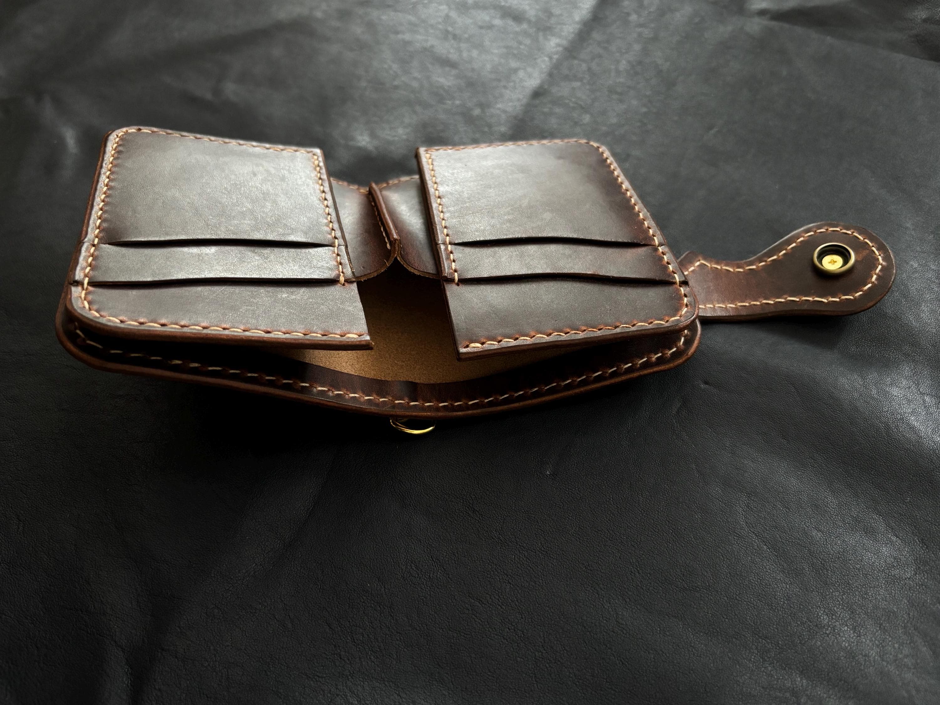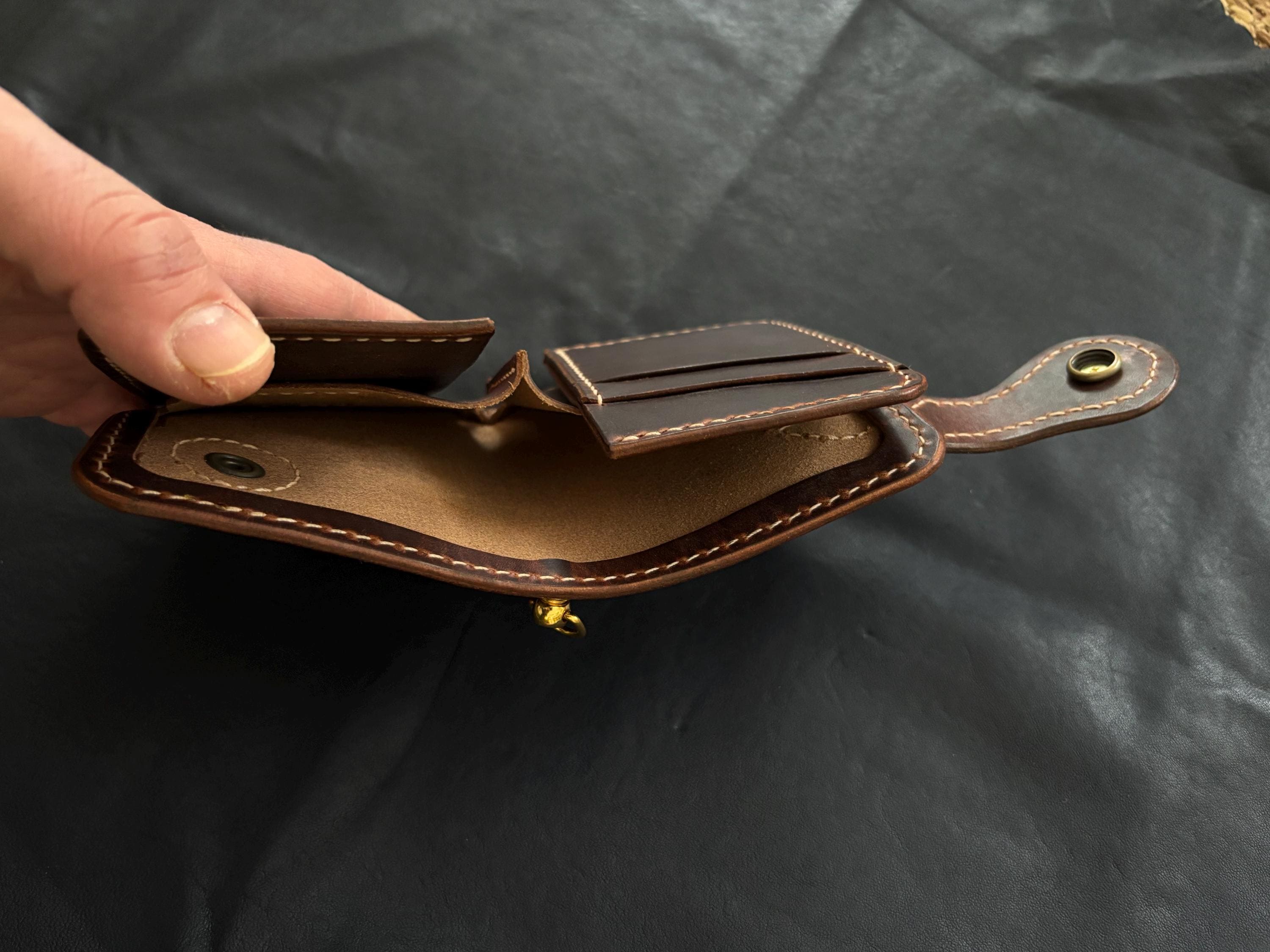 Biker wallet handcrafted using highest quality Cowboy Waxy Vegetable Tanned Leather comes from Conceria La Bretagna Tannery in Italy. It will hold up to the most rugged of use and develop a beautiful and unique patina over time.